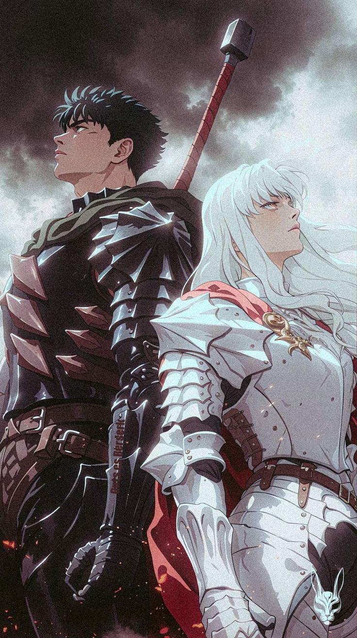 Dual-character contrast defines this style. Light tones from Griffith contrast with Guts’ darkness. The composition emphasizes duality.