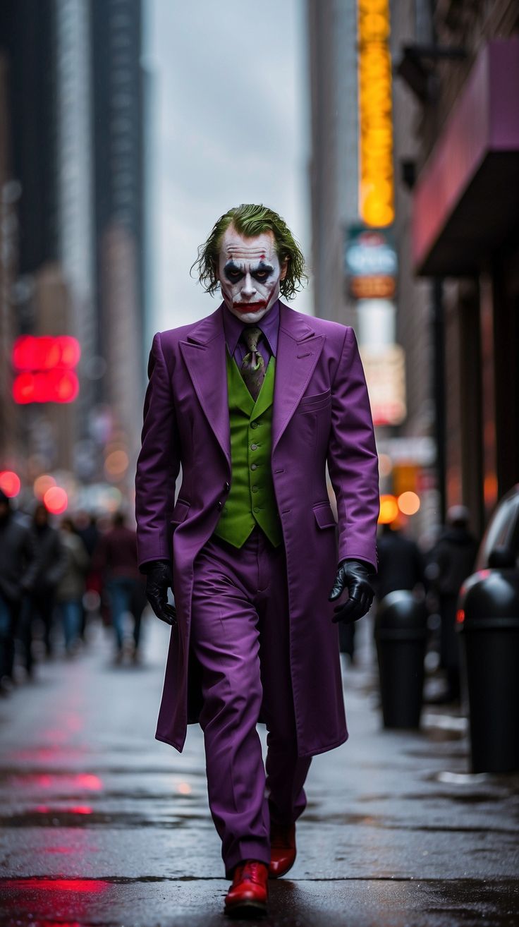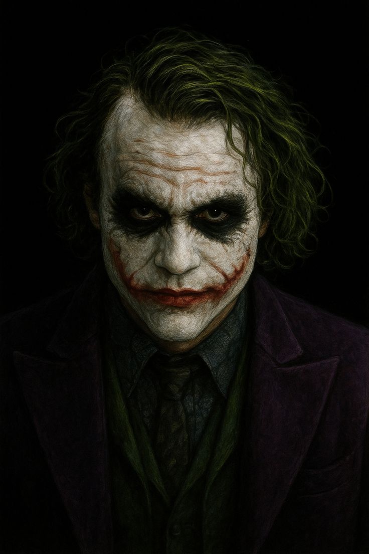Dark Knight edits focus on smeared makeup, greasy green hair, scarred lips, and sickly urban lighting. The palette often mixes green, gray, and dirty yellow. Framing tends to be tight. The expression does most of the work. Chaos is present, but controlled.