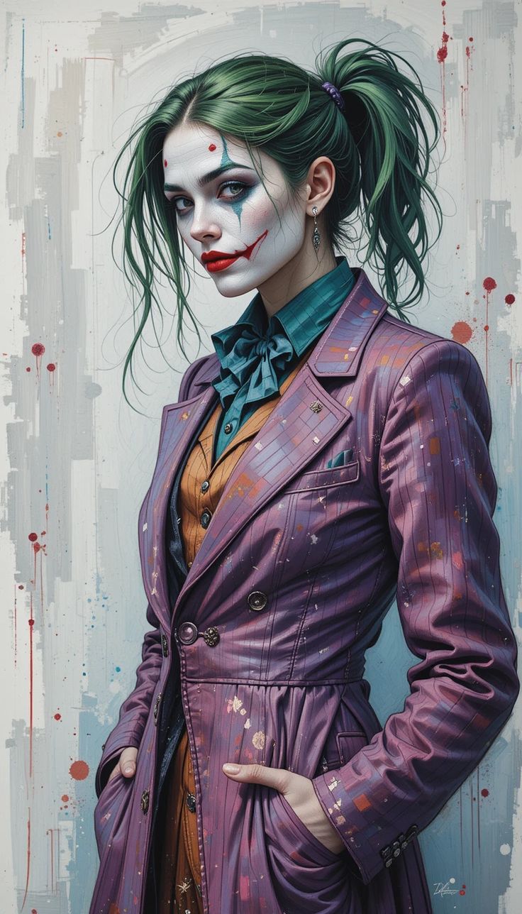 Female-coded Joker edits often reinterpret the character through soft contouring, smeared eyeliner, sharp lipstick, and fashion-led framing. Purple, black, and red accents are common. The pose is usually controlled. The image feels stylized rather than literal. Identity and performance intersect here.